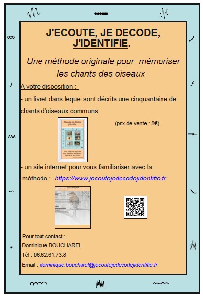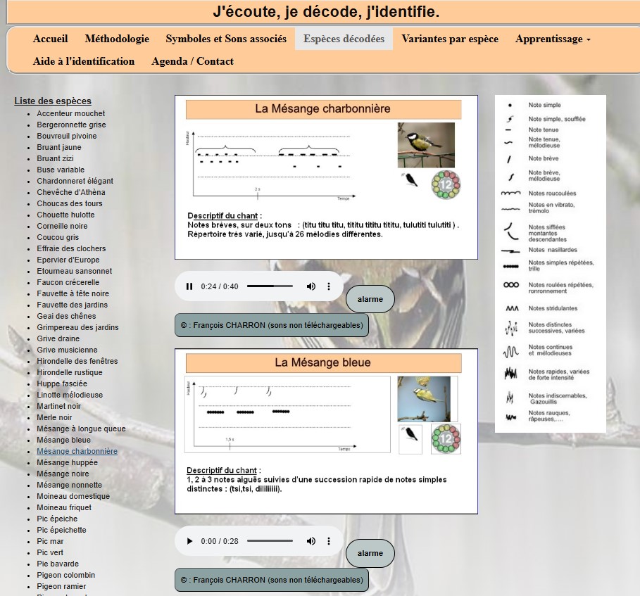 Ce site a été developpé pour vous exercer à la méthode de décodage des chants d'oiseaux, décrite dans le guide "j'écoute, je décode, j'identifie ". Il vous permet, dans un premier temps, de vous familiariser avec la symbolisation utilisée, et ensuite, de vous entraîner à l'écoute et au décodage, afin de vous préparer au mieux à la réalité du terrain.